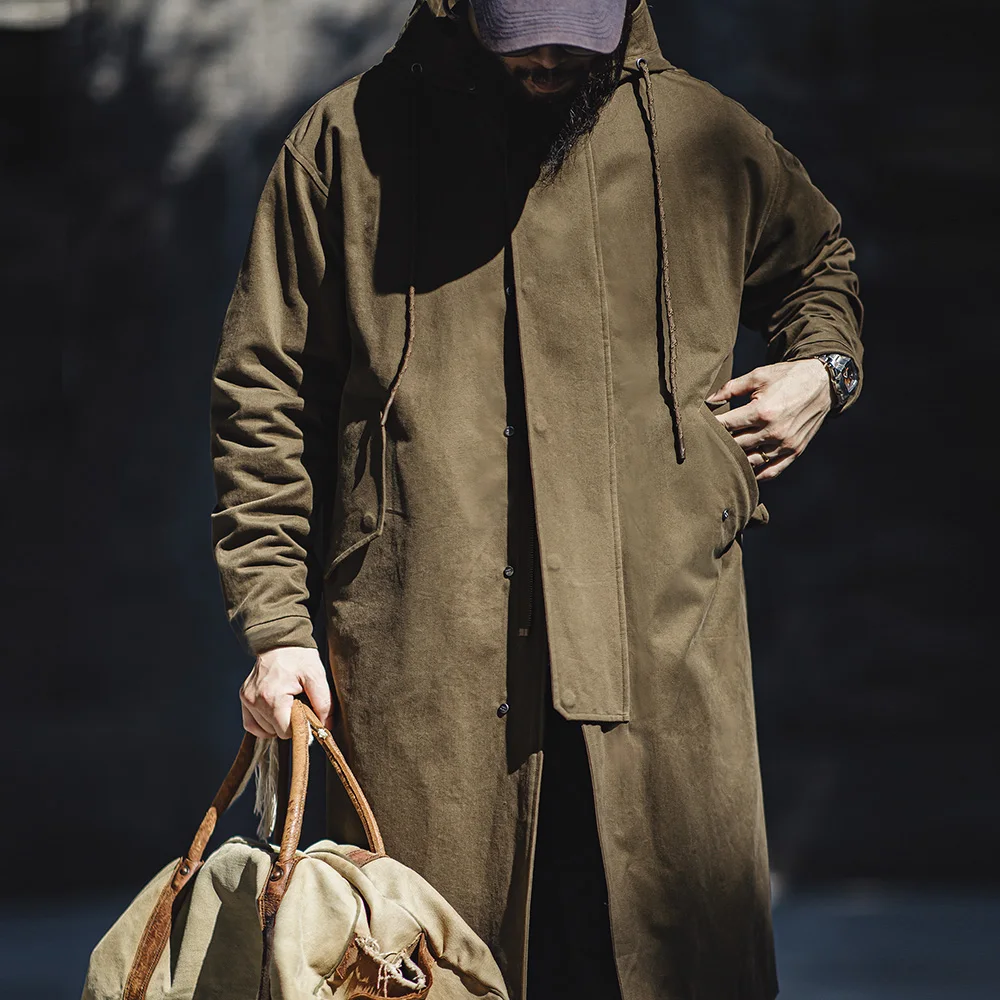 The Men’s Retro Military M51 Windbreaker combines vintage military-inspired design with modern functionality. This mid-length jacket features a classic turn-down collar complemented by a functional hood, offering versatile protection against changing weather conditions. The front closure includes both a durable zipper and metal snap buttons, creating a secure seal against wind while adding authentic military styling elements.